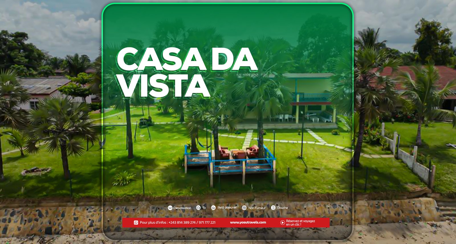 Idéalement situées face à l’océan Atlantique, à l’embouchure du fleuve Congo, au cœur du village de pêcheurs de Nsiamfumu, les résidences Casa Vista vous accueillent dans un cadre paisible et authentique. Profitez d’un séjour confortable, les pieds dans l’eau, dans nos logements meublés et entièrement équipés.